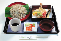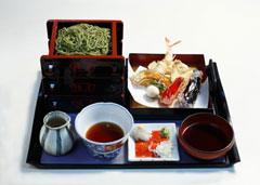 31年間「三段抹茶そば」一筋です。 カウンター席では、目の前で揚げたての天ぷらがご賞味いただけます。 ランチメニューとして揚立て天ぷら定食980円、ソバカラ800円等があります。
