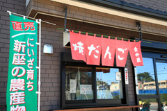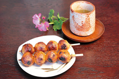 上新粉100%、昔ながらの手作り[焼だんご]です。醤油味の素朴な味は、お子様から大人まで幅広くご満足いただける逸品です。ちょっとした手土産にも最適です。当店では、ご注文いただいてから一本ずつ真心をこめて焼き上げます。お急ぎの折りは、お電話で事前のご予約を。