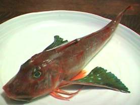 | ほうぼう  ◎カサゴ目ホウボウ科に属する魚です。方形の頭部、腹側が平らになっている細長い魚体、 広げると扇状になる大きな胸びれが特徴的な魚で、体長は40cmほどになります。鮮やかな 青緑色の胸びれ、白い腹、紅褐色の魚体のコントラストが見事な魚です。北海道南部から 南シナ海付近に広く分布しますが、本州中南部から東シナ海に多く、季節的に南北回遊を行います。 水深20〜100mの砂泥海底に生息し、胸びれの下にある3本の軟条(胸びれが変形したカニの 脚の様な器官)を使ってごかいやえびなどのえさを探して海底を這う様に移動します ◎冬が旬の魚です。雪が降る時期がおいしいと言われる様に冬が旬のきれいな白身の魚です。上品で淡白ですが、 うまみの濃い味がします。身離れがよく脂がのったプリプリした口当たりの良さを楽しみたいものです。 |